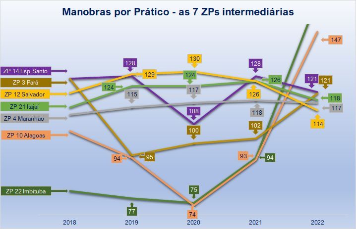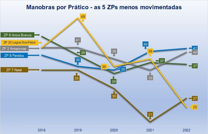 Quando voltamos a atenção para as Séries B e C, menos movimentadas, pouca coisa mudou. Observamos uma queda considerável da ZP 20 - Lagoa dos Patos, que esteve em crescimento no ano de 2019, porém, desde então apresenta queda no quantitativo de manobras por Prático. Em 2022, Lagoa dos Patos e Natal dividiram a lanterninha da Série C do Brasileirão de ZPs!